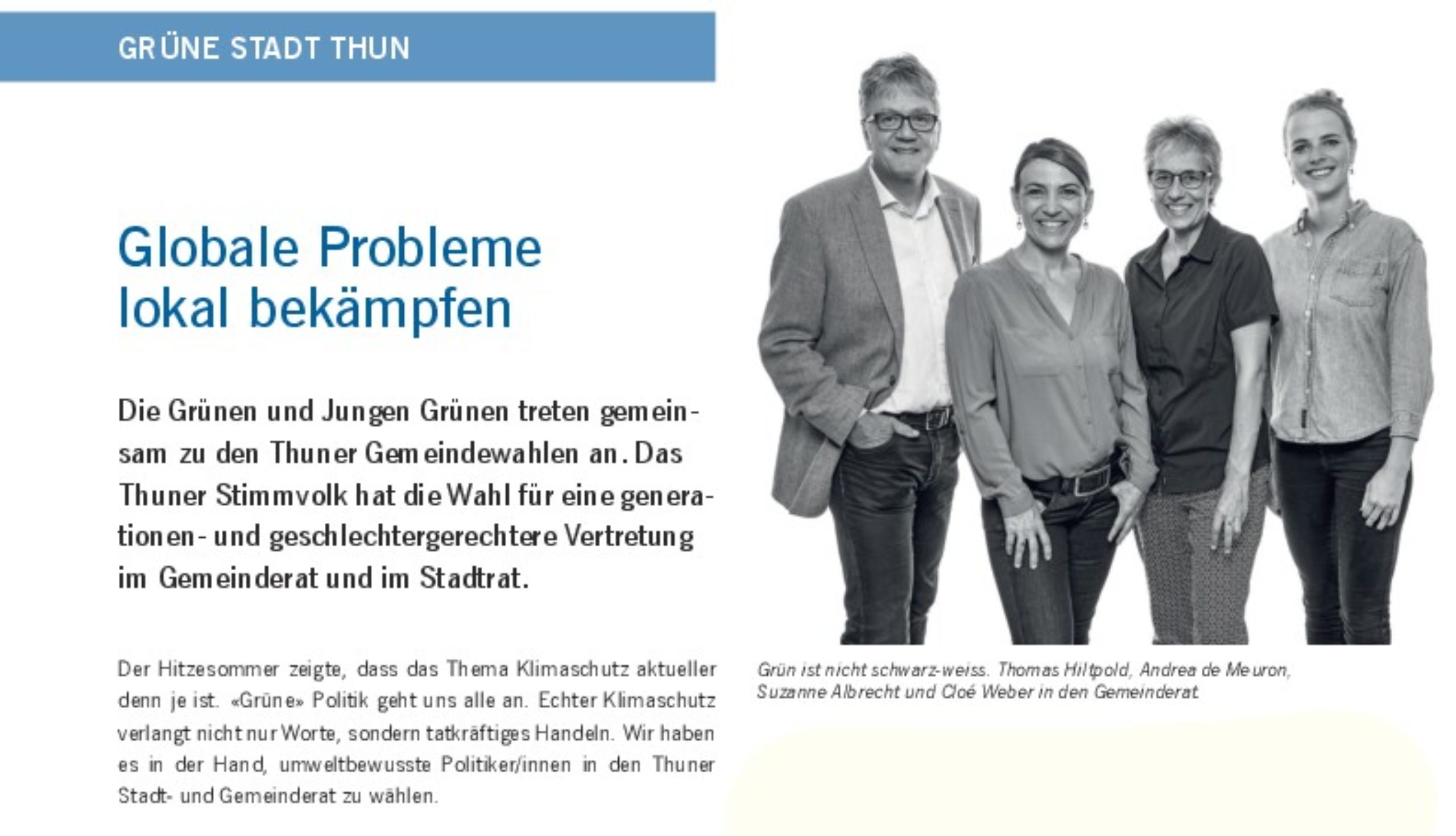 Der Hitzesommer zeigte, dass das Thema Klimaschutz aktueller denn je ist. «Grüne» Politik geht uns alle an. Echter Klimaschutz verlangt nicht nur Worte, sondern tatkräftiges Handeln. Wir haben es in der Hand, umweltbewusste Politiker/innen in den Thuner Stadt- und Gemeinderat zu wählen.